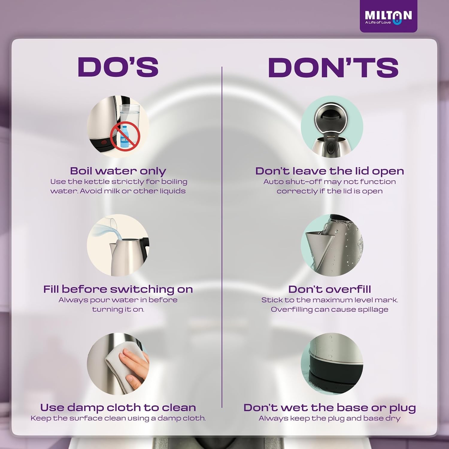 • Sturdy handle lets you touch it immediately after it stops functioning without having to worry about burning your hands. Wide mouth for easy cleaning, Hinded Lid for convenience. Supply: 230 Volts AC, 50 Hz., Power: 1500 Watts., This electric kettle has an Durable Stainless steel body made of 304 Stainless Steel. You can trust the product for its durability and safety., It has Ergonomically Designed Body. Just the place the kettle wherever you feel convenient and make your favorite beverage within a short span of time. Power indicator suggesting On/Off and Convenient On-Off button. Automatic Shut-off for safety and power saving.