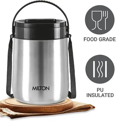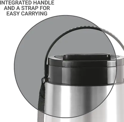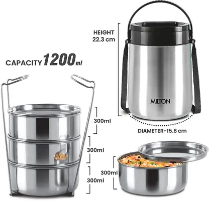 Color: Silver; Material: Stainless Steel; Package Content: 1 - Piece Steel Classic Tiffin (3 Containers, 300 ml Each); Dimension in cms (L x W x H): 15.3 x 15.3 x 18.8 Designed to carry your lunch in style Insulated stainless steel lunch box keeps food hot for long hours. PU insulated Tiffin comes with belt and integrated handle for easy carrying. Elegant design to carry your lunch in style in Insulated stainless-steel container with lifter. It is Easy to store, clean and maintain, it has belt for easy carrying, durable and virtually unbreakable construction. Carry your lunch to work or to a family get-together with ease and relish warm and fresh home-cooked food anywhere you go!